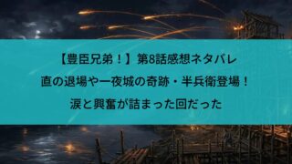 NHK大河ドラマ「豊臣兄弟!」第8話「墨俣一夜城」の感想・ネタバレをお届けします。直(白石聖)の退場、火矢で築いた一夜城のクライマックス、菅田将暉演じる竹中半兵衛の初登場など、涙と興奮が詰まった第8話を詳しく振り返ります。