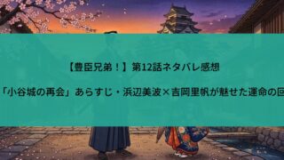 大河ドラマ「豊臣兄弟!」第12話「小谷城の再会」のあらすじ・感想をネタバレありでお届け。浜辺美波さん演じる寧々の感情爆発シーン、吉岡里帆さん演じる慶の圧巻の初登場など、見どころを徹底レビュー。次回「疑惑の花嫁」の予告情報もあわせてご紹介します。