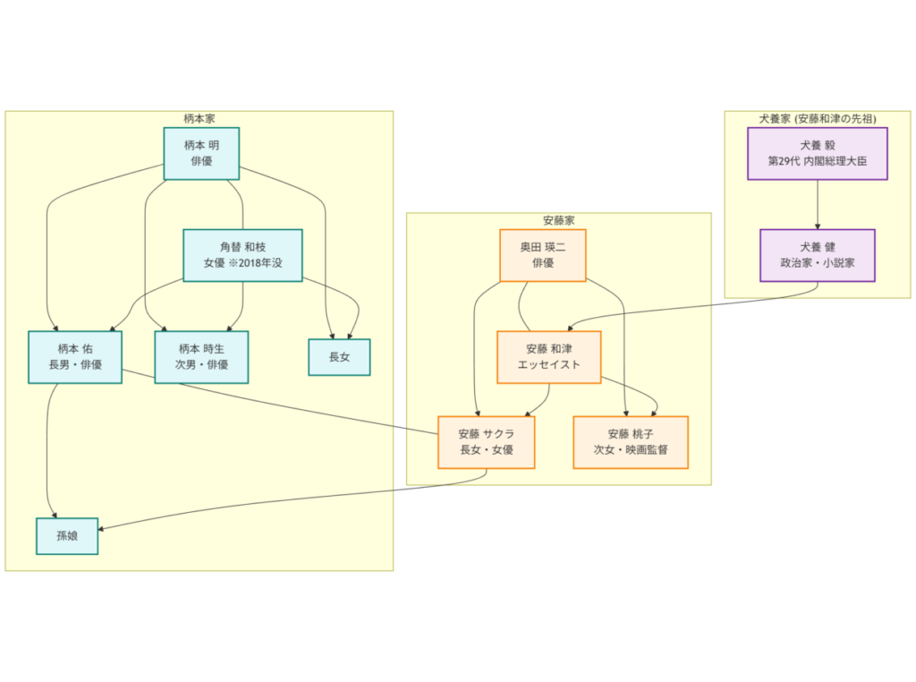 さらに補足すると、柄本家は演劇界での存在感が強く、東京乾電池を立ち上げた柄本明さんを中心に、息子の佑さん・時生さん、そして親戚にあたる安藤サクラさん一家まで含めると、映画・ドラマ・舞台のほとんどの分野に誰かしらが関わっていることになります。