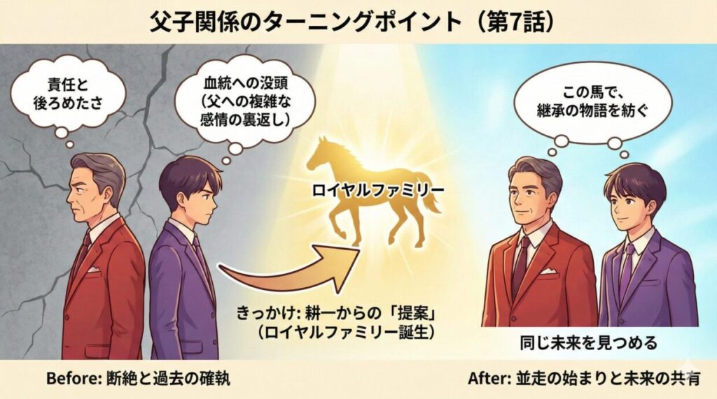 ビジネスとしての競馬と、家族としての想いが、同じテーブルに乗せられた時、父子の会話はようやく「本音」へと踏み込んでいきます。