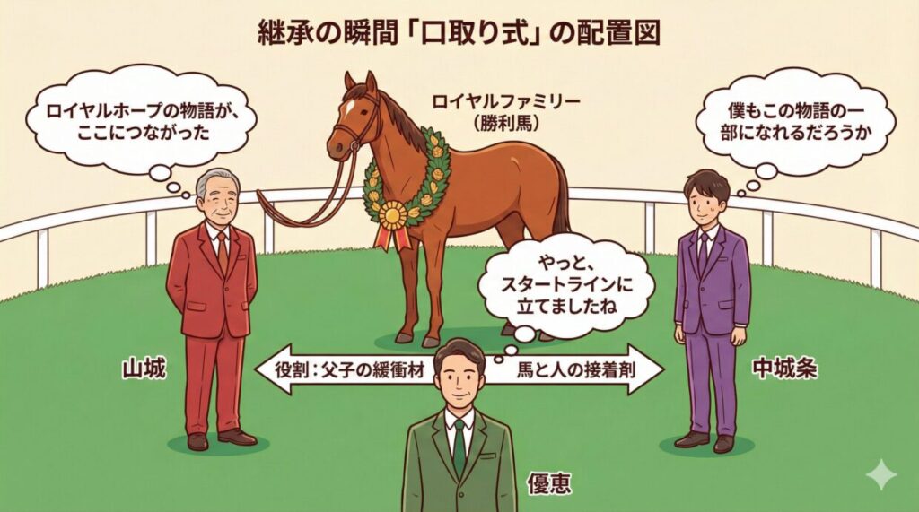 ロイヤルホープの物語を誰よりも近くで見てきた人として、会社・馬主・家族、それぞれの立場を受け止めながら調整役を引き受けていきます。
