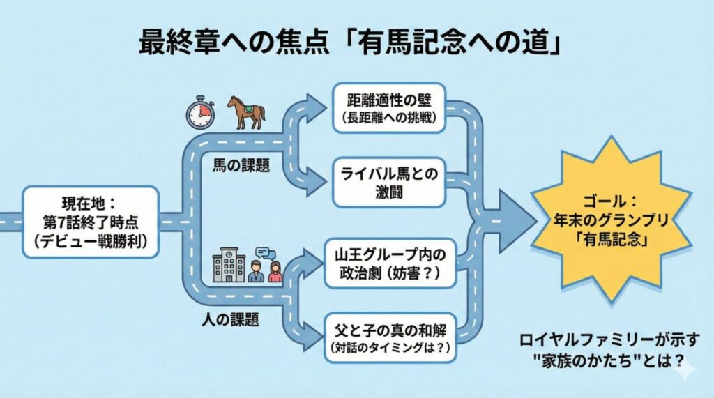 視聴者のあいだでは、「有馬記念でロイヤルファミリーがどんな走りを見せるのか」「耕一さんが本格的に馬主として立つのか」「耕造さんとどのタイミングで和解するのか」といった予想が盛り上がっています。