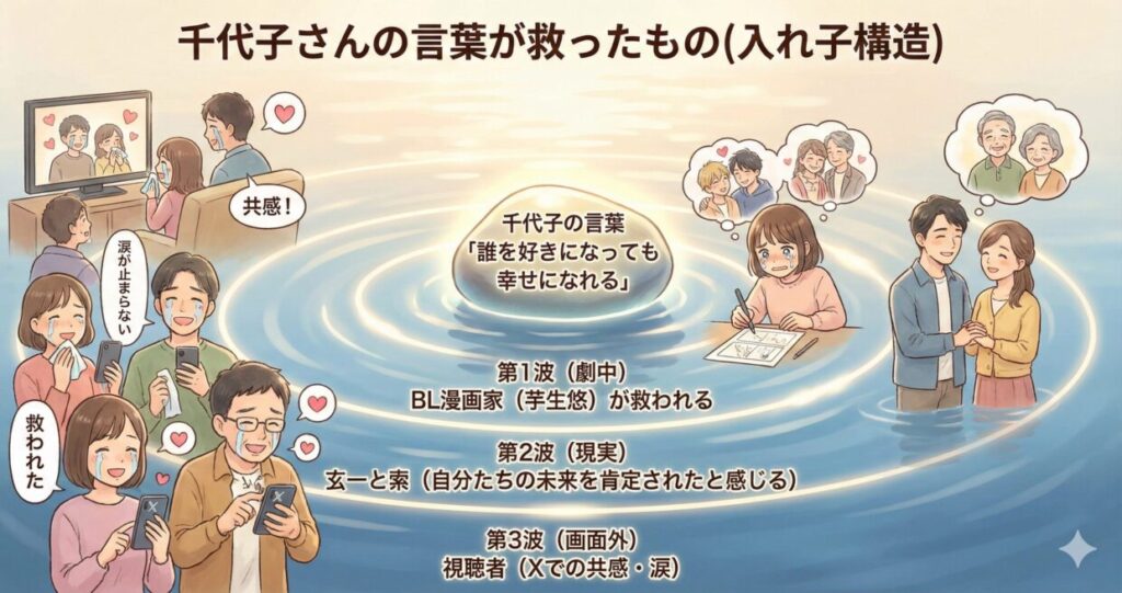 何より印象的だったのは、「誰を好きになっても幸せになれる」という千代子さんの言葉が、玄一と索だけでなく、視聴者一人ひとりにも届いているように感じられたことです。