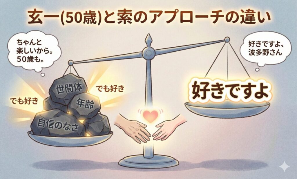 このハグがここまで刺さった理由のひとつは、玄一の「年齢設定」と「不器用さ」にあります。