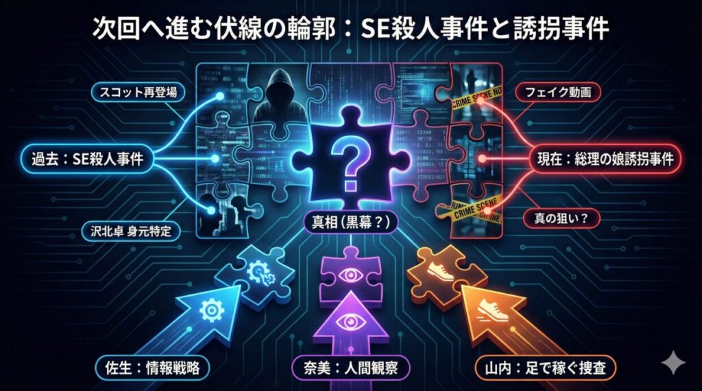 とはいえ、第8話の時点では誘拐事件はまだ完全な解決には至らず、犯人の真の狙いや、SE殺人事件との本当の関係性も、あえて”余白を残したまま”描かれています。