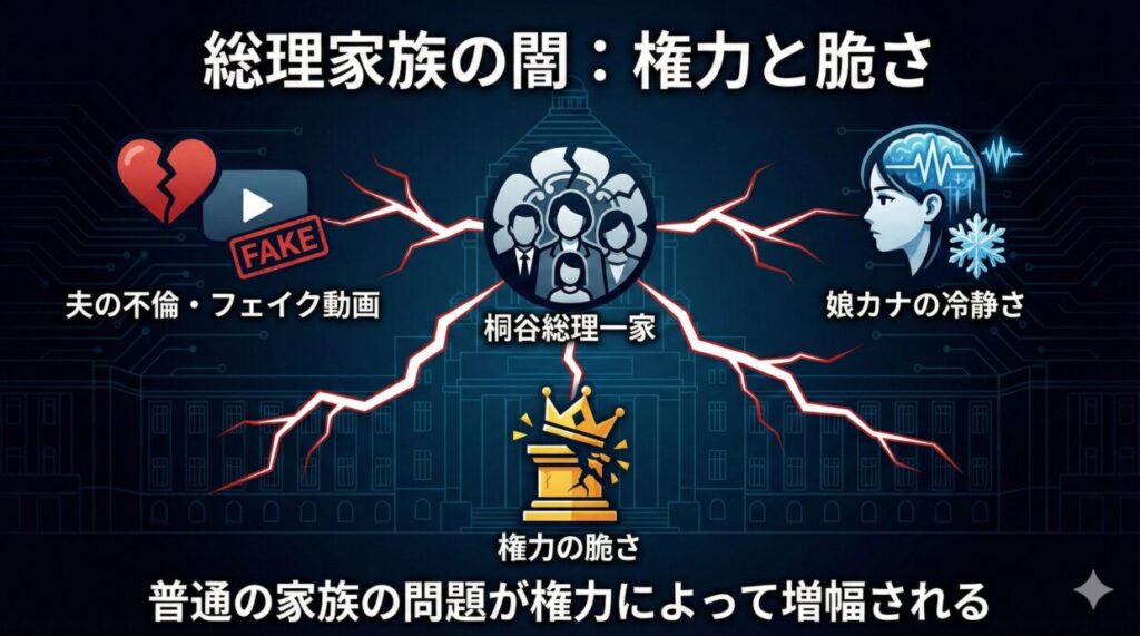 第8話を語るうえで欠かせないのが、桐谷杏子総理一家の”闇”の描かれ方です。