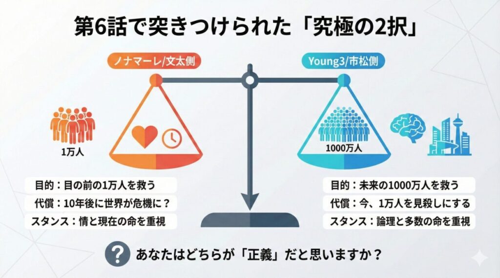 SNS上でも「市松の言ってることの方が論理的には正しい気がする」「でも1万人を見殺しにするのも違う」と意見が真っ二つに割れていました。