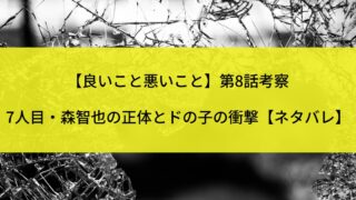 ドラマ 【良いこと悪いこと】第8話考察|7人目・森智也の正体とドの子の衝撃【ネタバレ】 『良いこと悪いこと』第8話のネタバレ考察!ついに判明した7人目・森智也(博士)の正体と「もう一人のドの子」瀬戸紫苑の衝撃とは?SNSで神回と絶賛された理由、間宮祥太朗×新木優子の圧巻の演技、残り2話の展開を徹底解説します。 ドラマ