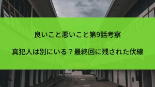 ドラマ 良いこと悪いこと第9話考察|真犯人は別にいる?最終回に残された伏線 『良いこと悪いこと』第9話考察・ネタバレ。真犯人は別にいる?宇都見逮捕の裏側と、次回予告「誰かが死ぬ」の意味を分析。未回収の伏線やSNSで話題の「ドの子」との関連をまとめました。 ドラマ